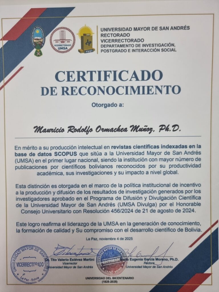Reconocimiento en mérito a la producción intelectual en revistas científicas indexadas en la base de datos SCOPUS, otorgado por las máximas autoridades de la UMSA / Sin categoría / By ticadmin